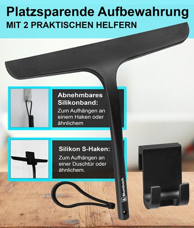 Mit dem Blumbach Premium Silikon Duschabzieher in schwarz oder weiß kannst du effektiv Wasser- und Kalkflecken vorbeugen. Einfach die Wassertropfen und den Nebeldunst nach jedem Duschen von Fliesen, Duschkabine, oder der Glastür abziehen. So hast du immer den klaren Durchblick.