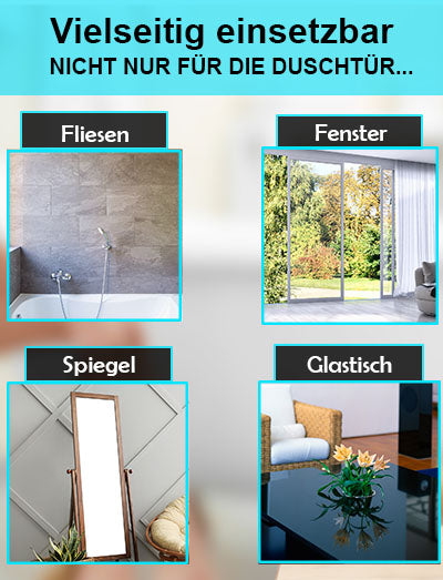 - 💦 Fenster, Balkontüren, Glastische, Autotüren, Fliesen, Glasflächen, glatte Kunststoffoberflächen, Balkontische, Duschrückwände aus Acryl oder anderen glatten Oberflächen, Duschkabinen und noch vieles mehr...