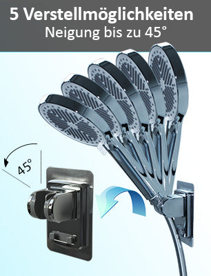 ✓ NEIGUNGSWINKEL 5 Stufen bis zu 45° verstellbar. Deshalb kann die Handbrause auch während des Duschens in der Halterung bleiben.