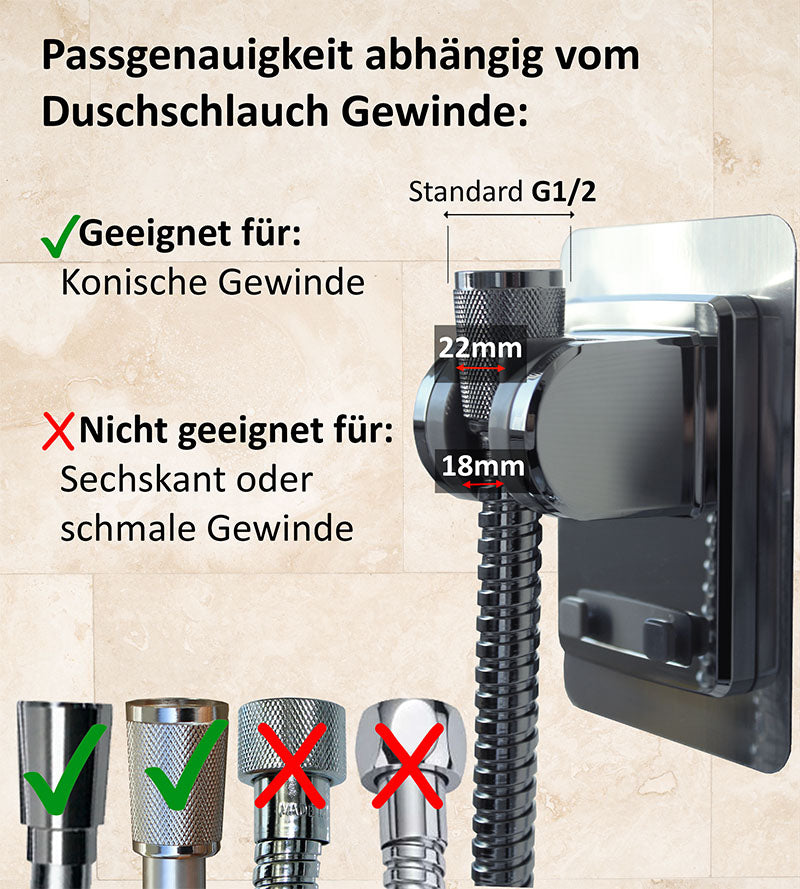 "Egal ob dein Brauseschlauch ein geriffeltes oder ein glattes Gewinde hat, dank der konisch zulaufenden Standard Größe von bis zu 22 mm gibt der Halter sicher auch deinem Brauseschlauch den nötigen Halt."