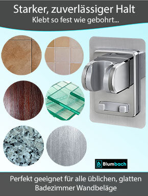 Dank des großen Power Klebepads kannst du den Blumbach® Brausehalter Sticky sogar auf unebene Flächen und über Fliesenfugen kleben! Selbst schwere Duschköpfe halten zuverlässig im Halter und lassen sich sogar in der Neigung verstellen!